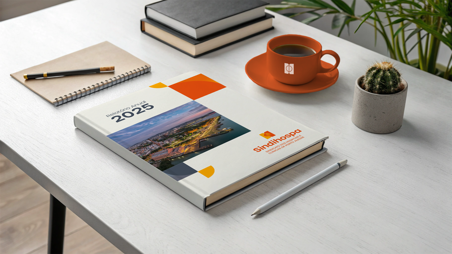 A partir da nova identidade visual, desenvolvemos aplicativos impressos, brindes e materiais digitais, além do estande do sindicato na Health Meeting Brasil 2025. O lançamento da marca, ocorrido durante a feira, foi o coroamento de um processo rigoroso e complexo, onde a participação efetiva do cliente foi essencial para contar mais um capítulo da história de um dos mais relevantes sindicatos de saúde do país.